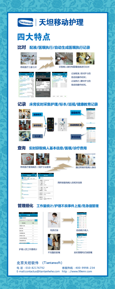 天坦移動護理系統(tǒng)改變傳統(tǒng)護理工作模式。將審藥、配藥、治療等環(huán)節(jié)實現(xiàn)移動化、條碼化、共享化。確保信息準確,用藥安全;系統(tǒng)將護理工作變得更方便、更自由,護士可以在任何地點調(diào)取病歷、化驗報告、檢查影像,利用各種移動終端完成醫(yī)囑執(zhí)行、床前護理文書錄入等護理操作,極大地減少護理管理人員的工作量,提高整個護理工作的工作效率與醫(yī)療質(zhì)量。
