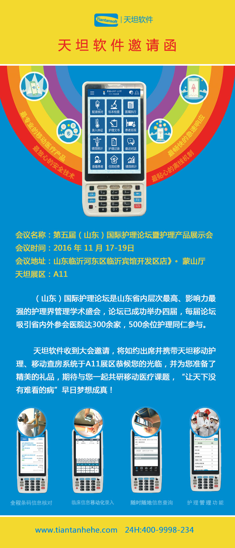 天坦軟件恭祝“第五屆(山東)國際護(hù)理論壇暨護(hù)理產(chǎn)品展示會”如期舉辦并取得圓滿成功,也期待這一次行業(yè)的交流盛會的到來,共同學(xué)習(xí)、共同進(jìn)步。天坦軟件將于A11展臺前恭候您的光臨。