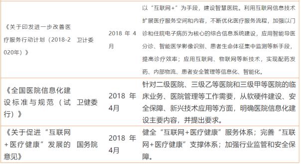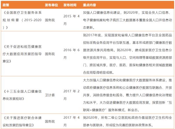 事實(shí)上,自2015年4月,國務(wù)院發(fā)布《全國醫(yī)療衛(wèi)生服務(wù)體系規(guī)劃綱要(2015-2020)》,提出加強(qiáng)人口健康信息化建設(shè),到2020年,實(shí)現(xiàn)全員人口信息、電子健康檔案和電子病歷三大數(shù)據(jù)基本覆蓋全國人口并信息動態(tài)更新,我國陸續(xù)出臺了一系列加速醫(yī)療信息化產(chǎn)業(yè)發(fā)展的政策。